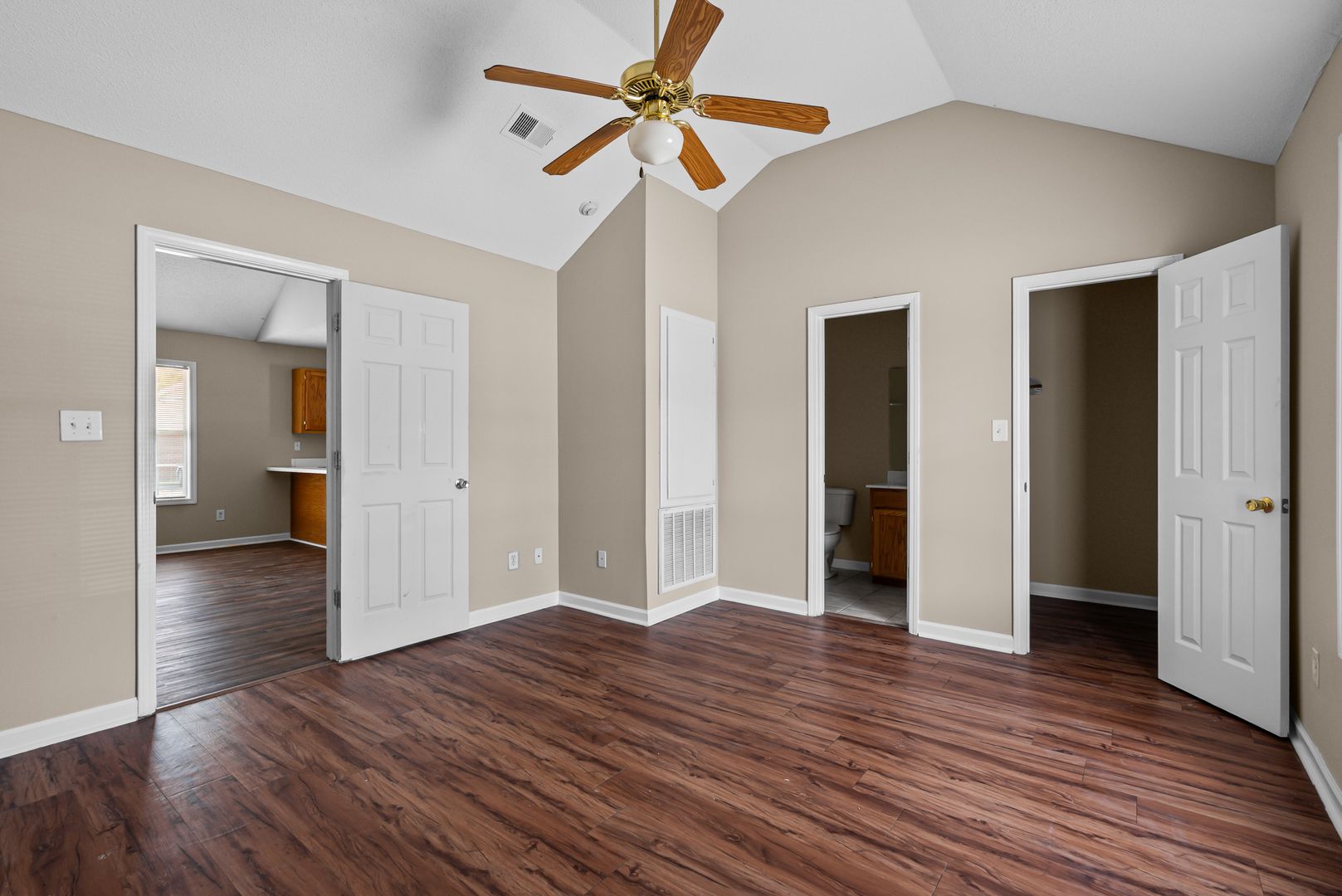 1 spacious bedroom with ceiling fans and ample natural light
